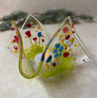 We're excited to be offering this fused glass candle holder class. Many people have been requesting a fused glass class. This is a great way to learn about glass and to enjoy a creative afternoon as you create a beautiful candle holder. You will learn about cutting and firing glass as you use frit, stringers, and murini.